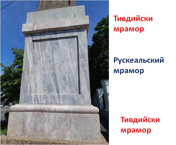 Цоколь столба – известный по петербургским набережным гранит-рапакиви. Далее, нежный и воздушный, делающий основание лёгким, тивдийский мрамор. Мрамор этот можно встретить и в Инженерном замке, и в Исаакиевском соборе, и в Мраморном дворце. Фасад Малого мраморного дворца на Гагаринской улице практически целиком облицован этим розовым камнем. Пьедестал верстового столба изготовлен из полосчатого рускеальского мрамора, добытого в Карелии, использованного в облицовке внешних стен Исаакиевского собора и, например, в вестибюле станции метро «Приморская». Выше, карниз, снова розовый тивдийский мрамор. Наконец, сам обелиск изготовлен из гранита-рапакиви. Во многих верстовых столбах используется шокшинский кварцит, в данном столбе этого камня нет.