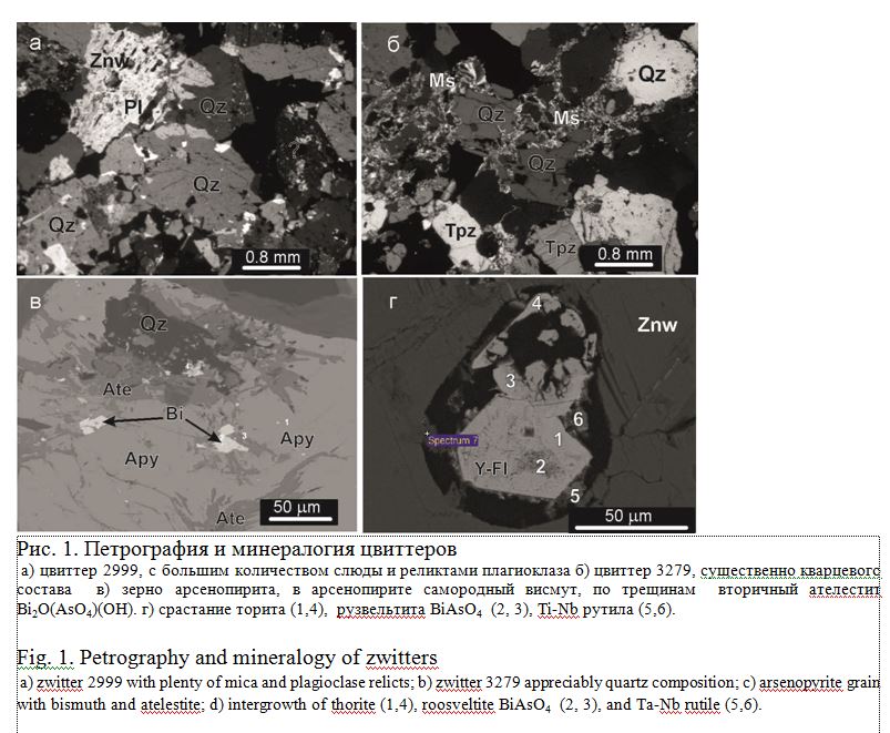 Акцессорная минерализация цвиттеров. Для цвиттеров Северного массива характерно сочетание литофильной и халькофильной минерализации. Обнаружены следующие акцессорные минералы: ториевый монацит, вольфрамит, вольфрамоиксиолит, вольфрам-ниобиевый рутил, колумбит, As-торит а также лёллингит, пирит, халькопирит, висмутин, самородный висмут, рузвельтит. Мышьяк и висмут, ввиду схожести геохимических свойств, повсеместно ассоциируют в цвиттерах (рис. 1, в). Отмечается пространственная связь минералов Bi и As с ториевым цирконом цвиттеров (рис. 1, г).