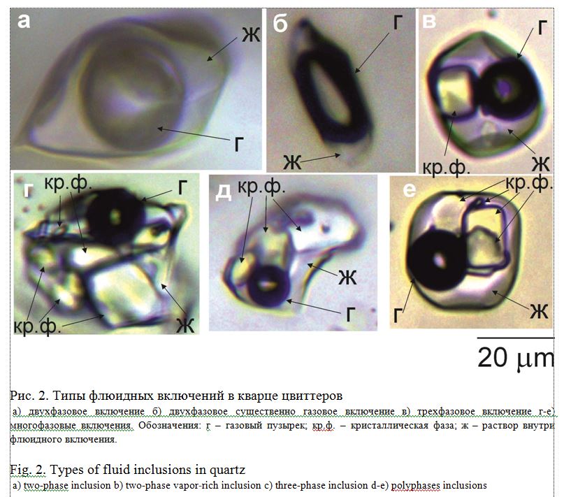 Флюидные включения в кварце цвиттеров. Включения в цвиттерах имеют разнообразный фазовый состав. Присутствуют двухфазовые газово-жидкие (рис. 2 а, б), существенно газовые, а также трех- и многофазовые включения, содержащие дочерние кристаллические фазы. Основное внимание уделялось изучению многофазовых включений (рис. 2, г-е). Среди кристаллических фаз включений установлены такие, рамановские спектры которых позволяют предположить, что они являются хлоридами железа. Соединения висмута, а также самородный висмут методами рамановской спектроскопии не обнаружены.