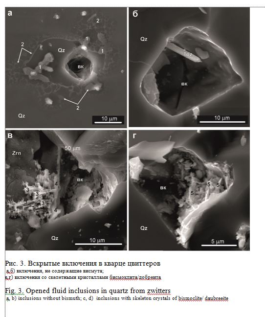 В сухих остатках некоторых флюидных включений в кварце цвиттеров Северного массива обнаружены минералы, состав которых отвечает бисмоклиту/добреиту. Наличие этих минералов позволяет предположить, что сами флюиды имели окисленный и кислотный соств, а Bi в них был растворен в хлоридной и частично во фторидной форме.