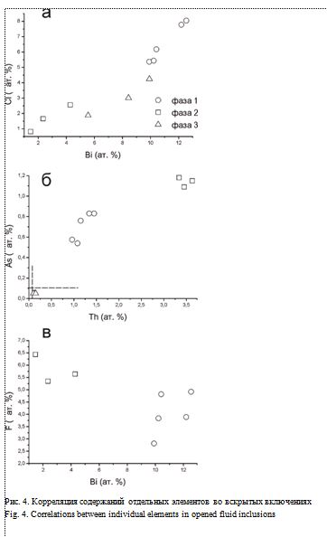 На рис. 4 приведены графики корреляций содержаний Bi, Cl, F, As и Th в сухих остатках включений образца 3279. На рис 4а очевидна прямая зависимость между концентрациями Bi и Cl для всех трех фаз, Таких же отчетливых корреляций между Th и As (рис. 4б) и между Bi и F (рис. 4в) внутри составов каждой из фаз нет. Однако все составы по Th и As также ложатся на прямую зависимость, аналогично Bi и Cl. Для Bi и F характерна обратная корреляция.