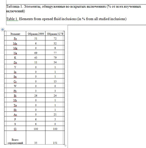 Кристаллические фазы, являющиеся результатом выпаривания растворов включений, обнаружены внутри вскрытых вакуолей и на поверхности кварца, непосредственно прилегающей к ним. Всего было изучено 230 вскрытых включений, частота встречаемости элементов во вскрытых включениях приведена в таблице 1. В большинстве случаев среди сухого остатка преобладают хлориды Fe, Na и K, а также Mn и Zn. Примеры некоторых вскрытых включений представлены на рис.3 Кроме того, были обнаружены включения, где среди кристаллических фаз сухого остатка преобладают необычные соединения – оксихлориды Bi (рис. 3 в, г). Составы кристалликов, обозначенных цифрами на рисунке 3 в и г, представлены в таблице 2. Важно также отметить, что кристаллы оксихлоридов в сухом остатке образуют скелетные формы (рис. 3 в).