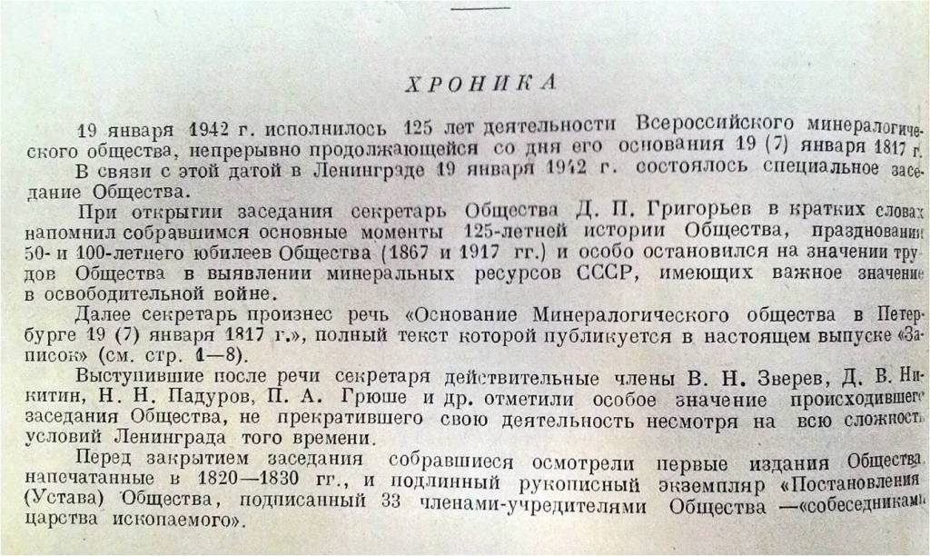 В 1942 году в блокадном Ленинграде в стенах Горного института прошло заседание, посвященное 125-летию Общества. Руководители Общества (А.П. Герасимов, Л.А. Варданянц) в то время находились в эвакуации, секретарь Д.П. Григорьев рассказал об истории Общества. Позднее полный текст выступления был опубликован в «Записках». Дальнейшие заседания Минералогического общества проходили уже в Свердловске.