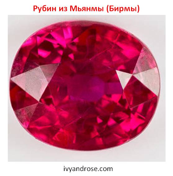 Лучшими в мире рубинами издавна слывут бирманские камни (сейчас Бирма называется Мьянма, правильнее сказать мьянманские рубины), добываемые на месторождениях, известных с VI в. н.э. Впечатляет площадь месторождений – 400 квадратных километров! Несмотря на 15 вековую историю разработки, эти копи и по сей день поставляют прекрасные образцы рубинов. Рубины Шри-Ланки имеют более спокойные и нежные, розовые оттенки. А вот рубины Таиланда, составляющие около 70% всего рынка натуральных рубинов, отличаются от камней Бирмы более тёмным, чуть бордовым оттенком. В России месторождения рубинов отсутствуют.