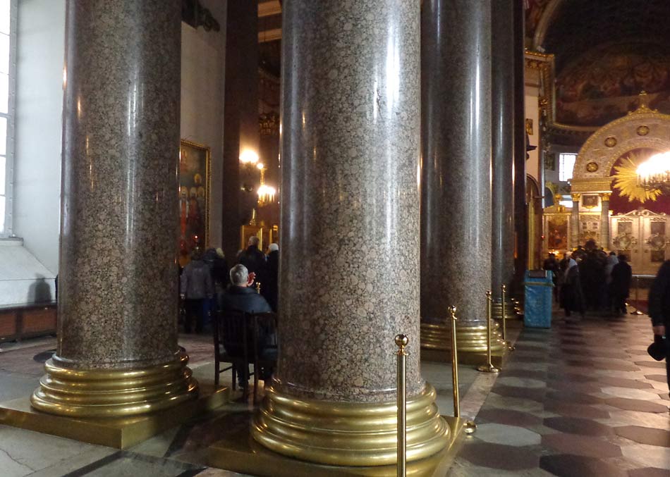 Итак, во время строительства Казанского собора для изготовления колонн внутреннего убранства был выбран выборгский гранит рапакиви. В 19 веке гранит выламывали вручную., обработка и доставка одной колонны высотой почти 11 метров стоила 3 тыс.рублей. Для отделки интерьеров Казанского собора было использовано 56 колонн, кроме того, Андрей Воронихин запланирован запасную гранитную колонну. Иностранцев, изумляли русские рабочие, строившие Казанский собор. «Им, этим простым мужикам в рваных полушубках, не нужно было прибегать к различным измерительным инструментам: пытливо взглянув на указанный им план или модель, они точно и изящно ее копировали. Глазомер этих людей чрезвычайно точен. С окончанием постройки торопились; несмотря на зимнее время и 13-15 градусов мороза работы продолжались даже ночью. Крепко зажав кольцо фонаря зубами, эти изумительные работники, забравшись на верх лесов, старательно исполняли свое дело. Способность даже простых русских людей в технике изящных искусств поразительна» (цитата из Храмы Невского проспекта. Из истории инославных и православной общин Петербурга, Архимандрит Августин (Никитин)).