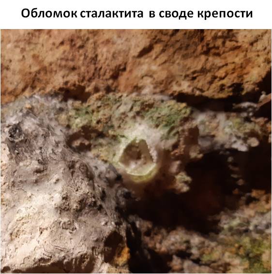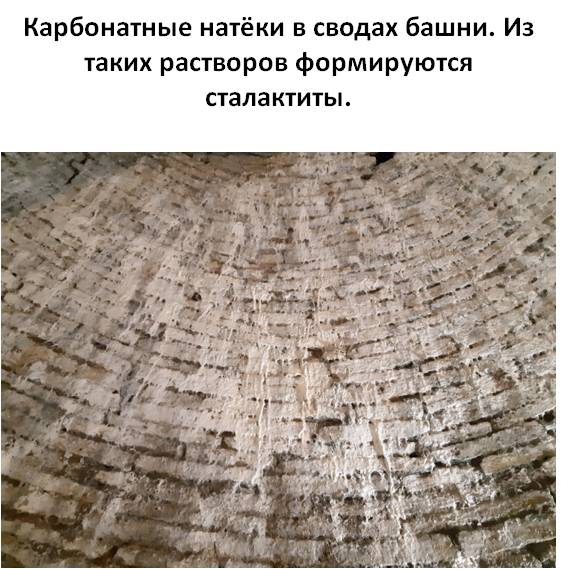 Ещё один любопытное геологическое явление, которое можно наблюдать в крепости Орешек – формирование сталактитов. #Сталактиты растут из карбонатных растворов, которые могут образовываться при растворении известняка в стенах и перекрытиях крепости. В тех местах, где мы были, все сталактиты уже обломаны и видны только их основания. Зато, такой «корешок» сталактита позволяет увидеть это природное образование изнутри: внутри сталактиты полые, там расположен подводящий канал, по которому стекают растворы, формирующие сталактит. А вот сосульки растут совсем иначе: там вода натекает снаружи.