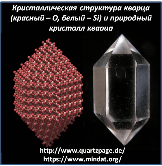 Кварц – минерал, структура которого образована всего двумя химическими элементами: кислородом (О) и кремнезёмом (Si). Соединяясь меж собой, эти кристаллы слагают тригональную кристаллическую решётку кварца. Кварц может иметь разнообразные цвета, но его структура «читается» опытным глазом без труда (см. галерею). Кристаллография рассказывает о том, в какую решетку соединились химические элементы.