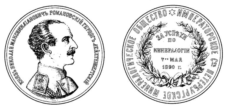 Николае-Максимиллиановская медаль, наряду с медалью А.И. Антипова (Морозов, 2012), является наградой Минералогического общества за вклад в развитие геологических знаний. Эта медаль не только увековечила имя президента Общества, но и являлась памятным знаком для наиболее выдающихся ученых конца XIX в, работавших на благо Отечества под девизом «минералогия во всем пространстве сего слова».