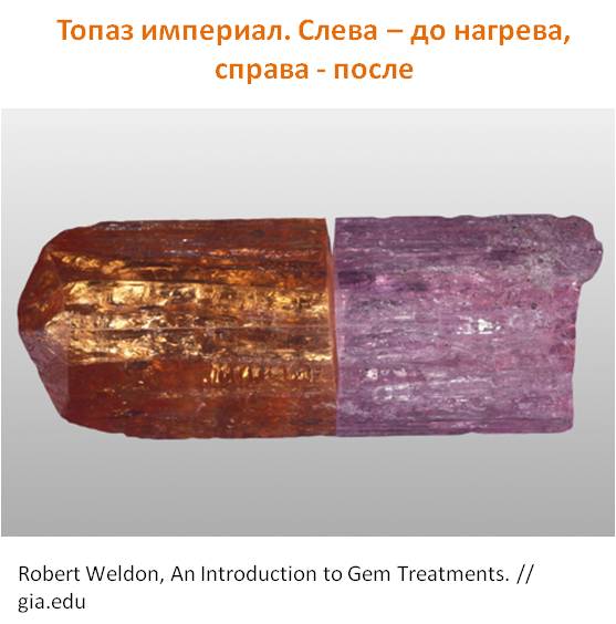 Топазы греют, усиливая природную окраску, или получая новые (таким способом можно получить жёлтые, оранжевые, зелёные цвета).