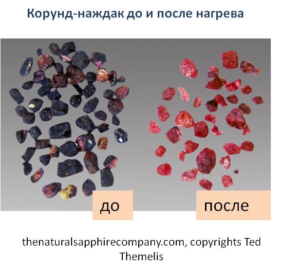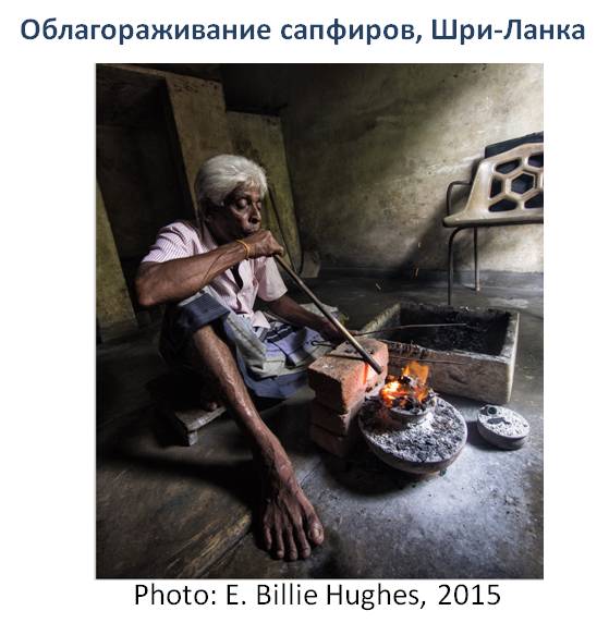 Один из древнейших методов облагораживания корундов – прогрев на высоких температурах. Этот камень весьма термостойкий, поэтому температуры порядка 1000 градусов Цельсия корунду (а также его разновидностям, сапфиру и рубину), не страшен. Древнейший метод, описанный ещё Аль-Бируни, применяется в Шри-Ланке и по сей день (фото в галерее). С помощью паяльной трубки и высоких температур мастера творят чудеса: после нагрева окраска сапфиров становится насыщенной, некоторые включения исчезают, улучшается чистота, цветность и ценность камня.