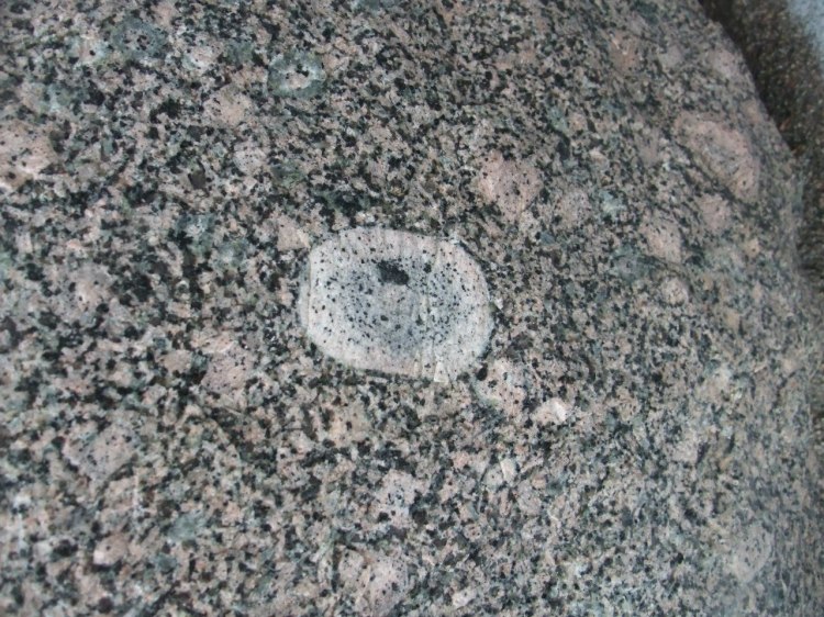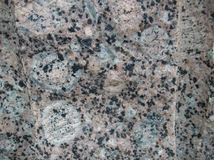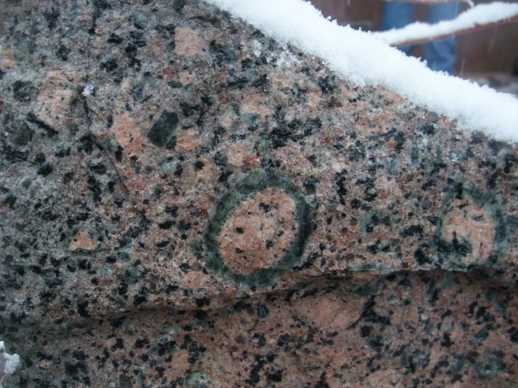 Гранит — вовсе не скучный серый камень, он может быть очень разнообразен по окраскам и рисунку камня (структуре и текстуре, как скажет геолог). Любопытную вещь зачастую можно увидеть в гранитах – округлые вкрапления серого, красного, розового цвета, с ободочком. Такие образования называются овоидами, и представляют собой срастание двух минералов – полевого шпата и плагиоклаза. Название овоид произошло от латинского ovum, «яйцо». Эти минеральные срастания действительно напоминают яйца по форме, да и в разрезе (можно ведь разглядеть «желток» и «белок»). Овоиды придают гранитам не только оригинальность текстуры, но и влияют на прочность камня. Увы, овоиды легко крошатся и камень разрушается быстрее, за что и получил название «гнилой камень» — рапакиви. Такой гранит широко распространён на территории Финляндии и севере Ленинградской области, именно он сформировал неповторимый облик классического Петербурга.