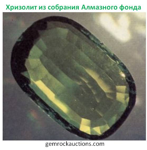 Уникальная огранка камня: хризолит имеет овальную форму, верхняя чуть выпуклая площадка окружена ступенчатыми гранями, на обратной стороне расположено множество неправильных четырёхугольных граней. В современной терминологии огранку можно даже назвать фантазийной. Существует версия, что этот хризолит – исторический «изумруд», сквозь который император Нерон наблюдал за устроенным им в Риме пожаром. Сама по себе эта версия (минерал насквозь прозрачен!) позволяет представить, насколько чист и идеален этот камень! Хризолит находился в чудесной золотой оправе с тридцатью бриллиантами, утраченной в настоящее время. Сейчас камень экспонируется без оправы, впрочем, такому красавцу не нужна компания, ведь он прекрасен сам по себе!