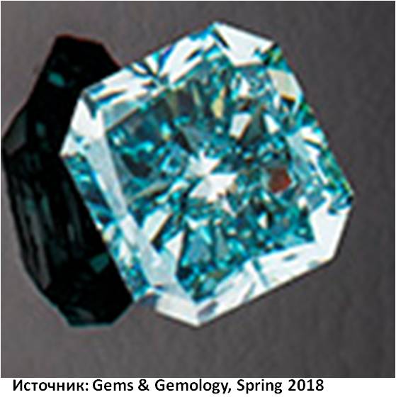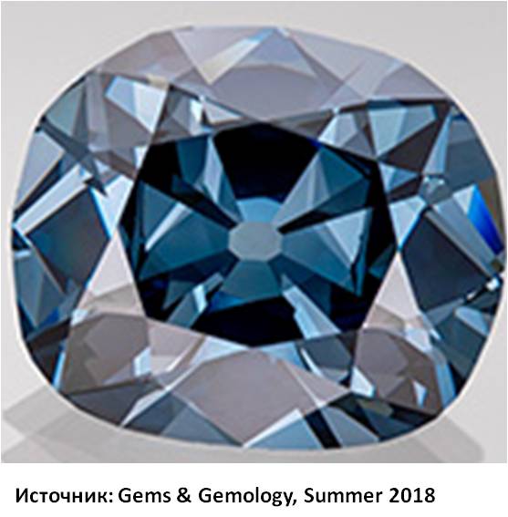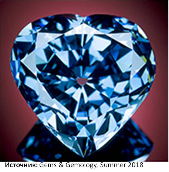 Природная окраска голубых и синих бриллиантов обусловлена примесями бора (фото из статьи Sally Eaton-Magaña, Christopher M. Breeding, and James E. Shigley Natural-Color Blue, Gray, and Violet Diamonds: Allure of the Deep// Gems & Gemology, Summer 2018, Vol. 54, No. 2)