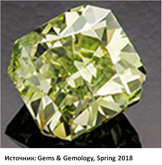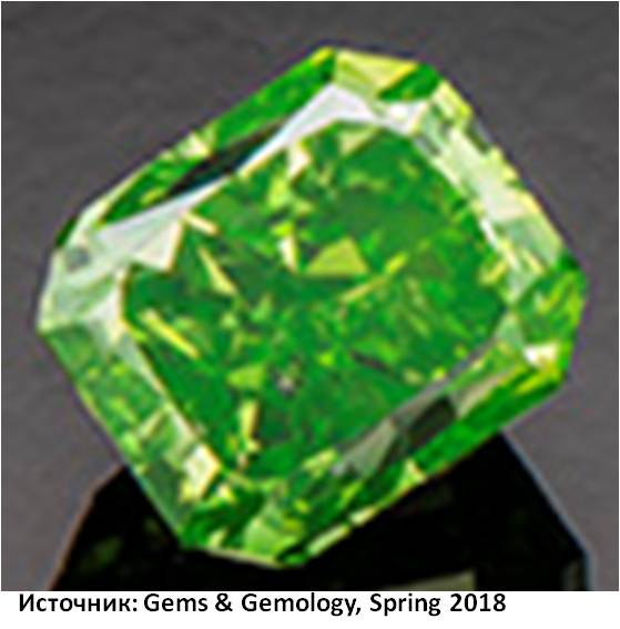 Зелёные алмазы как правило, из Южной Африки. Обязаны своей окраской разнообразным причинам, это могут быть радиационные дефекты или присутствие никеля. Примеси урана и тория так же придадут алмазу зелёный цвет. Фото с зелёными бриллиантами (Natural-Color Green Diamonds: A Beautiful Conundrum Christopher M. Breeding, Sally Eaton-Magaña, and James E. Shigley // Gems & Gemology, Spring 2018, Vol. 54, No. 1)