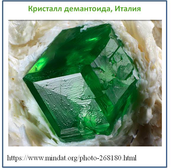 Кроме того, конец 19 века – открытие уральских зелёных гранатов, демантоидов. Демантоид – «подобный бриллианту», назван так за свою высокую дисперсию (способность разлагать видимый свет на спектральные линии). В этом свойстве демантоид опережает алмаз!
