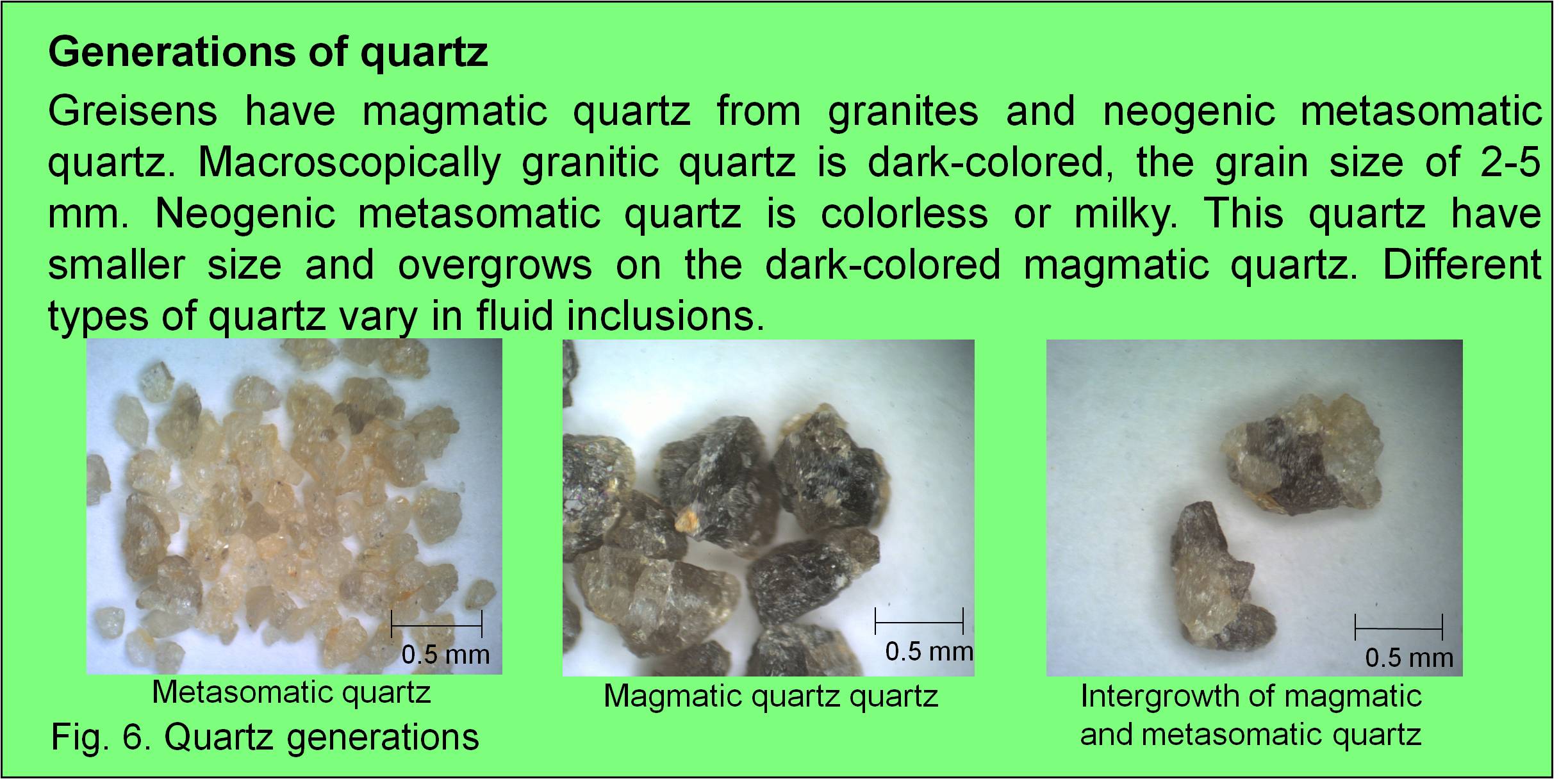 We studied fluid inclusions in quartz from zwitters by microthermometry (thermocamera Linkam THMS 600 Mining University, Saint-Petersburg) and ion microprobe (JSM-6390LV, Yekaterinburg) for identification conditions of metasomatic rocks formation.