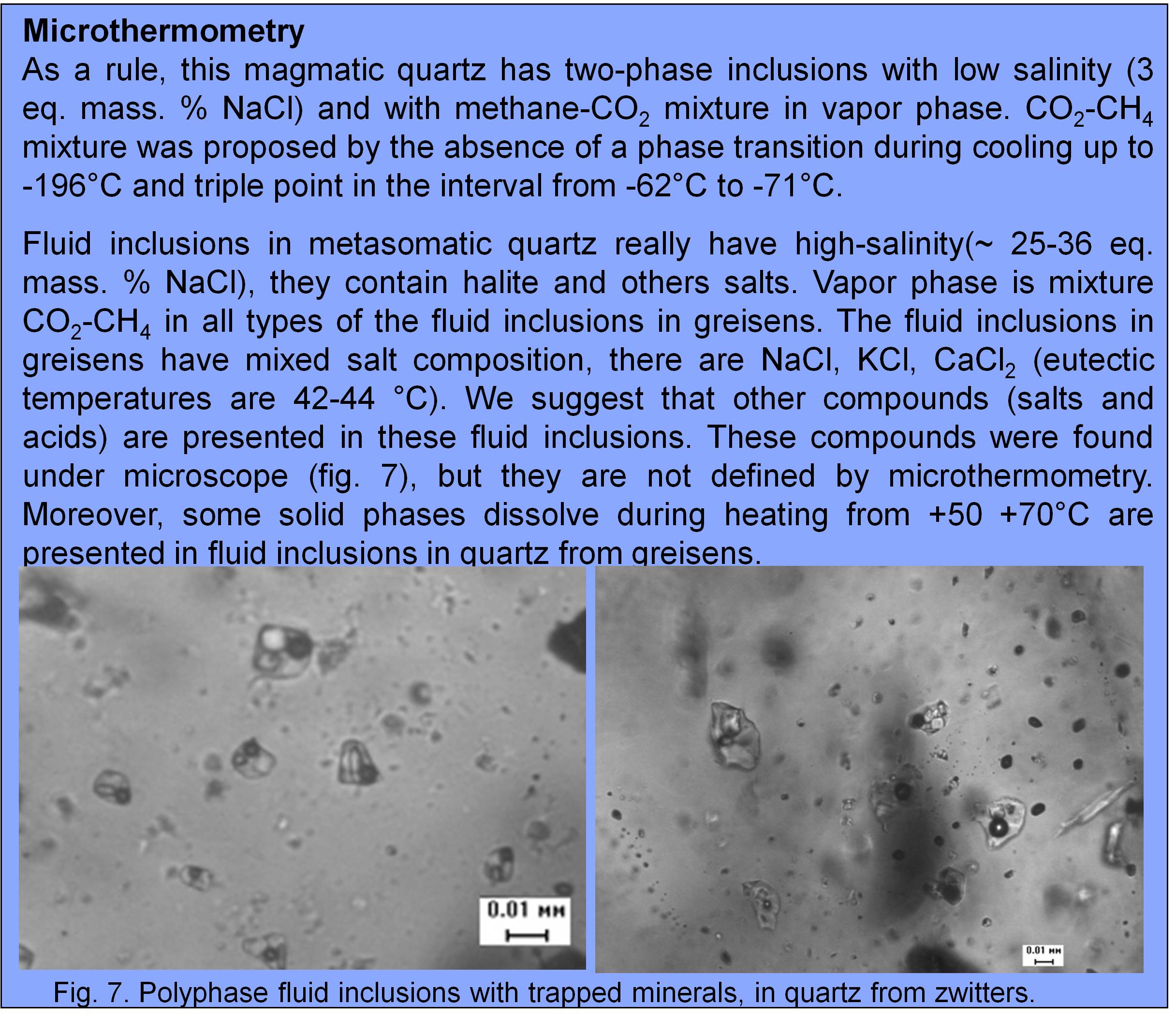 Fluid inclusions in quartz have diverse phase composition. Sometimes inclusions have trapped minerals, this fact indicates their primary genesis. Secondary fluid inclusions are located in cracks, in chains crossing one ore more quartz grains. Surely, zwitters have magmatic quartz from granites and new metasomatic quartz. Macroscopically “granitic” quartz is dark-colored, grains are 2-5 mm size. As a rule, this magmatic quartz have two-phases inclusions with low salinity (3 mass. % NaCl) and with methane in gas phase. Methane was diagnosed by absebse phase transition during cooling up to 196 and gas-hydrate formation at interval from -80 to -40. Metasomatic quartz is colorless or milky. This quartz overgrows on dark-colored magmatic quartz. Fluid inclusions in metsomatic quartz are actually high-salinity, contains halite and others salts. Gas phase is mainly methane in all types of fluid inclusions in zwitters. Fluid inclusions in zwitters have mixed salts composition, there are NaCl, KCl, CaCl2 (eutectic temperatures are 42-440). Obviously, other compounds (salts and acids) presence in fluid inclusions. These compounds are detected under microscope (fig. ), but they are undiagnosed by microthermometry. Moreover, some hard phase dissolving during heating from +50 +700 are presented in fluid inclusions in quartz from zwitters.