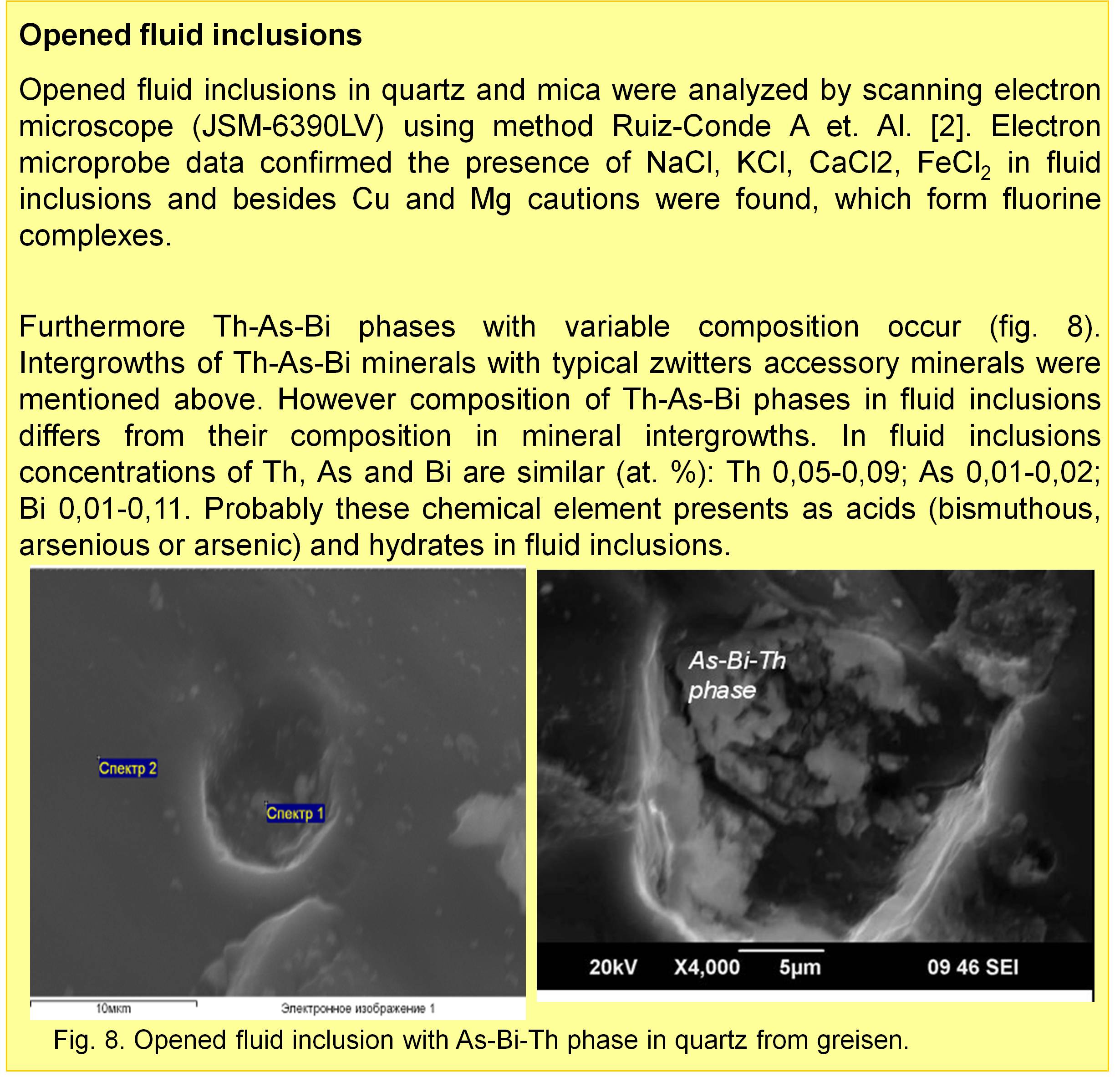 Besides Th-As-Bi phases with variable composition were founded. Intergrowth of such mineral phases with typical zwitters accessory minerals were mentioned above. However, coposition of Th-As-Bi phases in fluid inclusions differ from their composition in mineral intergrowths. In fliud inclusions concentrations of Th, As and Bi are same (at. %): Th 0,05-0,09; As 0,01-0,02; Bi 0,01-0,11. The most probably, in fluid inclusions these chemical element presents as acids (висмутовой, мышьяковистой (HAsO2 или мышьяковой H3AsO4) and hydrates. Thus, Th-As—Bi specialization of zwitter solutions reflected not only in new Th-As-Bi mineral phases, but in fluid inclusions also. Now we don’t know surely forms of transportation and precipitation of this elements. But we surely know that Th, As and Bi are closely associated in zwitters and these element are typomorphic for zwitters at Severny massif.