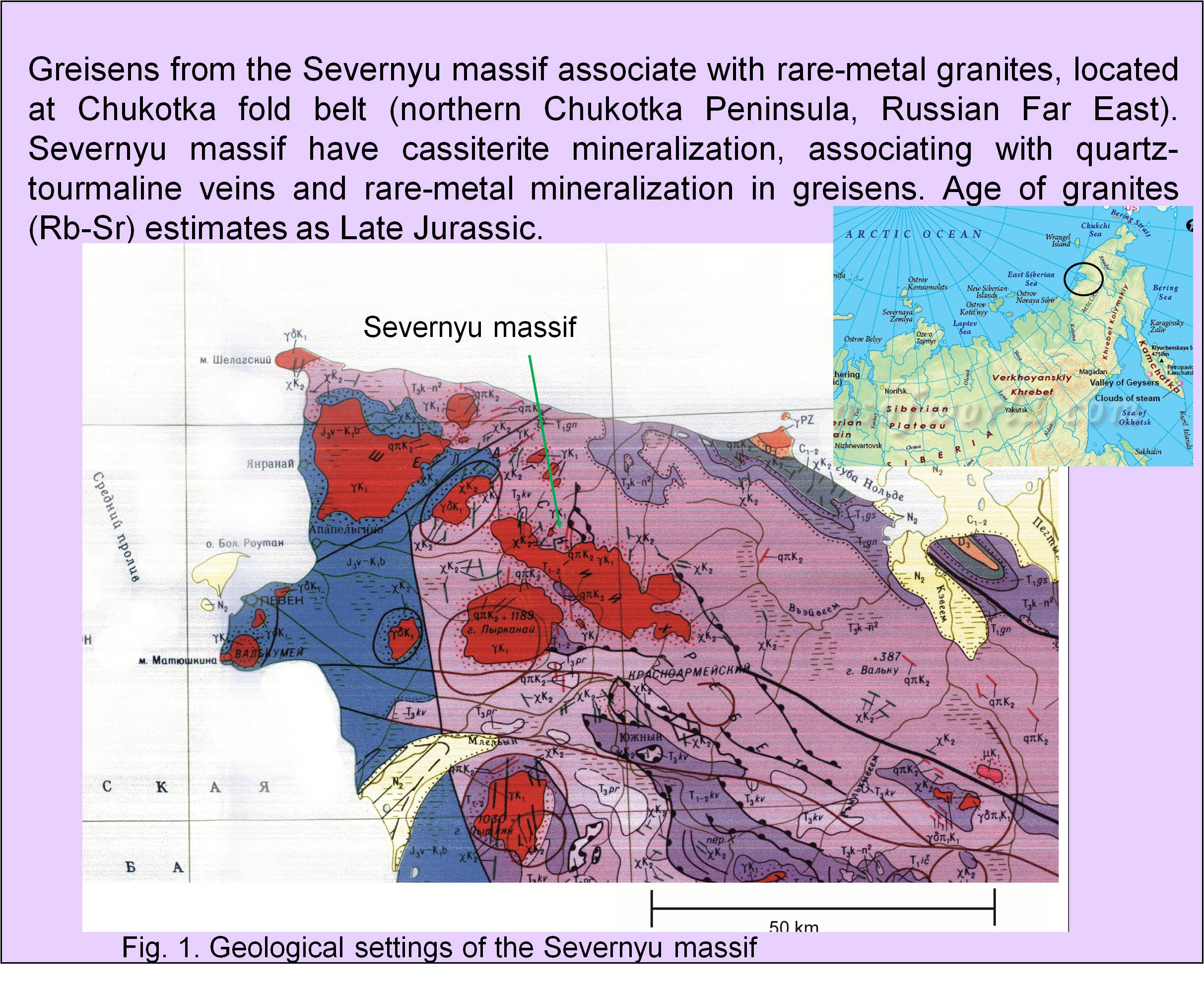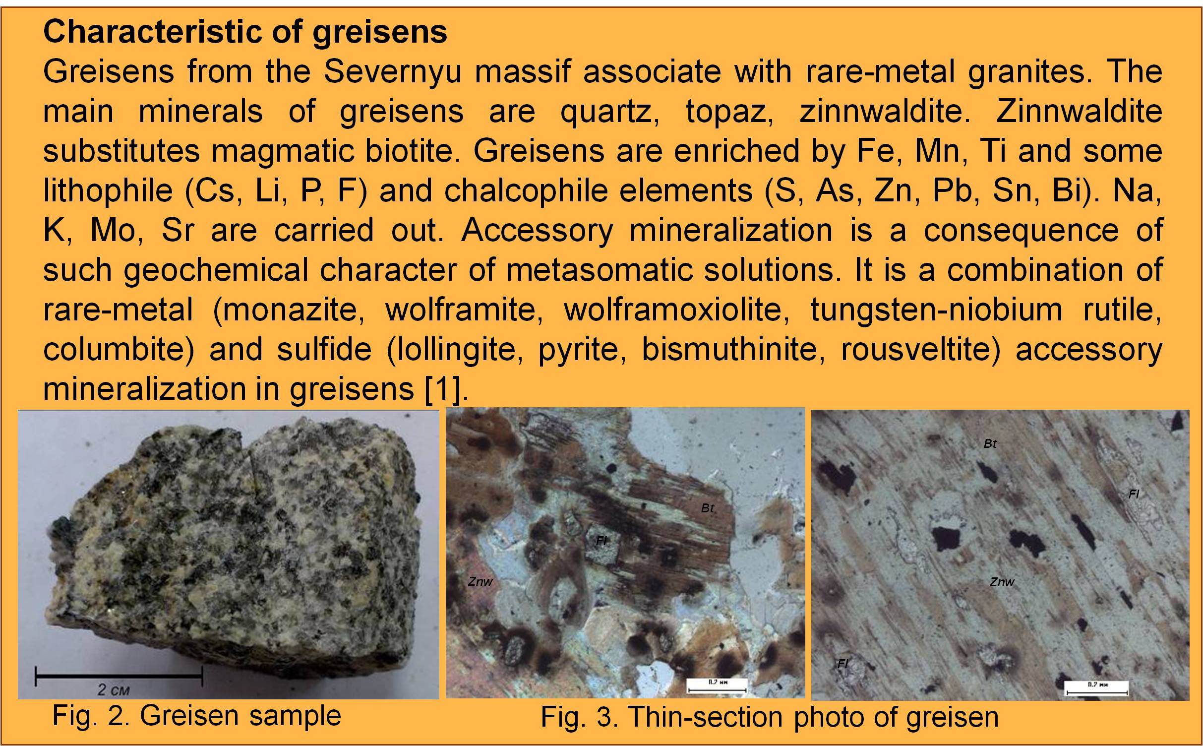 Published: Kurguzova A., Klyukin Yu.Arsenic-Borum-Thorium fluids of greisens from Severnyu granitic massif // ECROFI XXII Abstract Book. 2013. Antalya, Turkey. — pp.65-68
