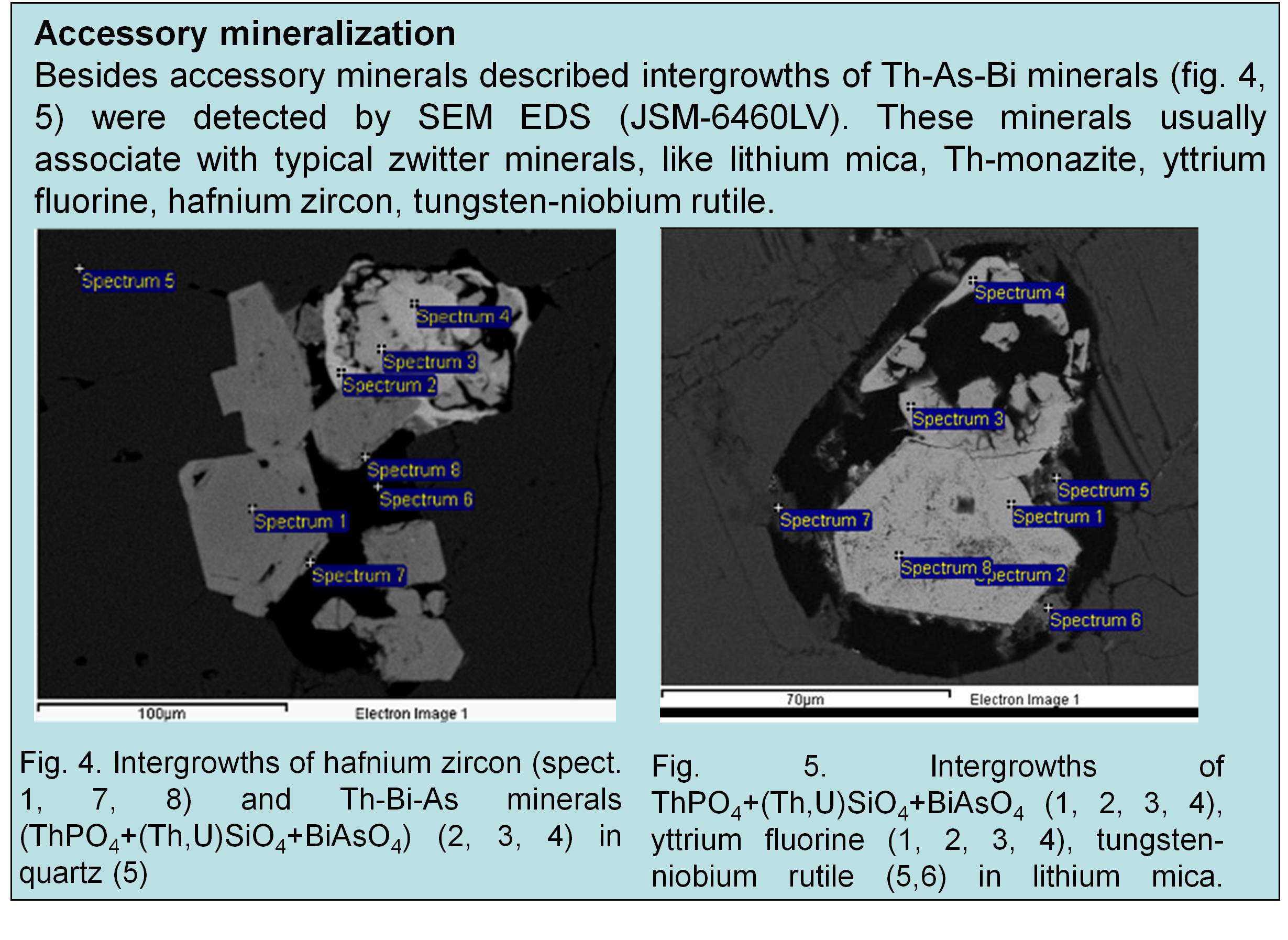 Lithium mica from siderophillite(KFe2AlAl2Si2O10(OH)2)—polylithionite (KLi2AlSi4O10F2), row is typomorphic mineral of zwitters. This mica usually substitutes magmatic biotite from granites. Zwitters are enriched by Fe, Mn, Ti and some lithophile (Cs, Li, P, F) and chalkophil (S, As, Zn, Pb, Sn, Bi) chemical elements. Na, K, Mo, Sr are carrying out. Accessory minerals are consequence of such geochemical character of metasomatic solutions, zwitters have combination of rare-metal (monazite, wolfrmite, wolframoxiolite, tungsten-niobium rutile, columbite) and sulfide (lelligite, pyrite, bismuthine, As-thorite rousveltite) accessory mineralization. There are detected mix of Th-As-Bi mineral phases besides decribed accessory minerals. These “mineral phases” usually associate with typical zwitters mineral, like lithium mica, Th-monazite, yttrium fluorine, hafnium zircon, tungsten-niobium rutile). According to 45 iom microprobe analyses (JSM-6460LV, Mining University, Saint-Petersburg) Th-As-Bi phases have invariable composition and they usually characterized by relation Th>>As>Bi. Variations of element content are (at. %): Th 0,20-0,23; As 0,05-0,10; Bi 0,02-0,07.