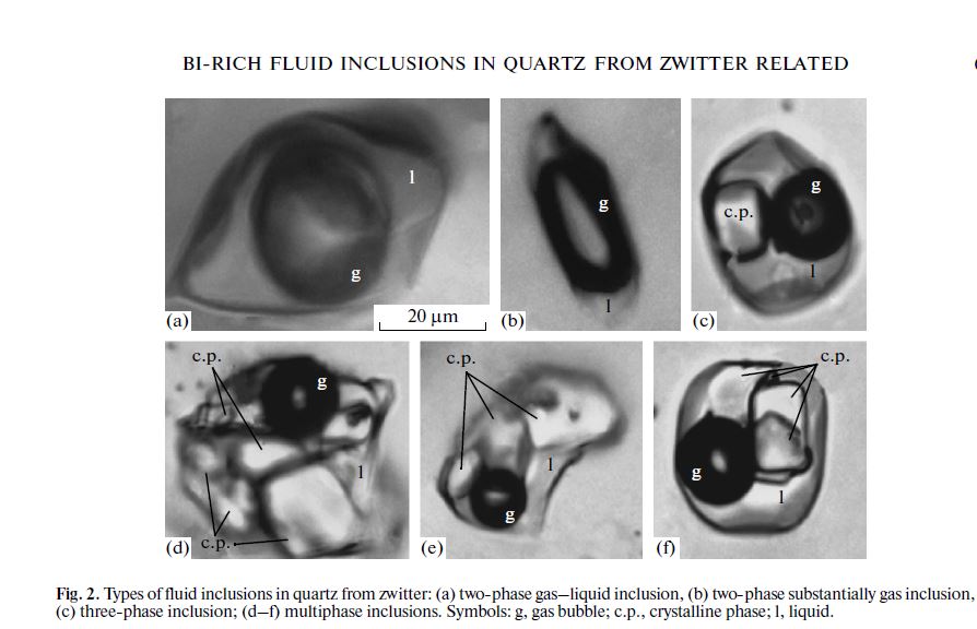 Fluid inclusions in zwitter have different phase compositions. Two_phase gas_rich inclusions (Figs. 2a, 2b), as well as multiphase crystal_rich inclusions are observed. Our main attention was focused on multiphase inclusions (Figs. 2d–2f). Based on Raman spectra of the daughter minerals in the fluid inclusions, we assume that one of the crystalline phase is Fe chloride. Neither bismuth compounds nor native bismuths were identified with Raman spectroscopy.