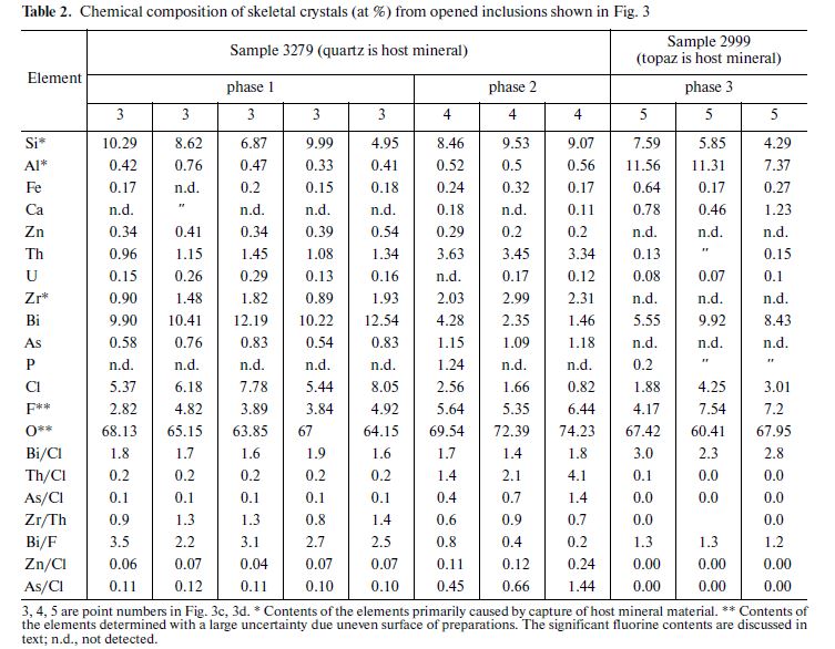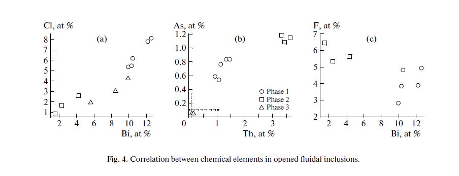 The above data show that the phases detected in opened inclusions are products of the crystallization of the solutions enriched in Bi, Cl, Th, As, and F. Bismuth oxychloride likely is one of dominating phases.