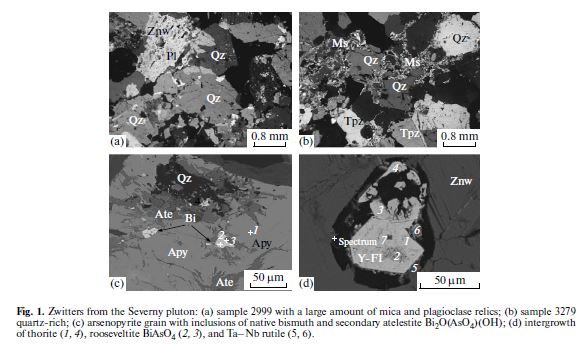 Zwitters in the Severny pluton are characterized by a combination of lithophile and chalcophile mineralization. The following accessory minerals have been identified: Th_ monazite, wolframite, wolframoixiolite, W–Nb rutile, columbite, As_thorite, as well as loellingite, pyrite, chalcopyrite, bismuthinite, native bismuth, and rooseveltite. Arsenic and bismuth closely associate in zwitter mineralization due to their geochemical affinity (Fig. 1c). Bi and As minerals are spatially associated with Th_zircon (Fig. 1d).